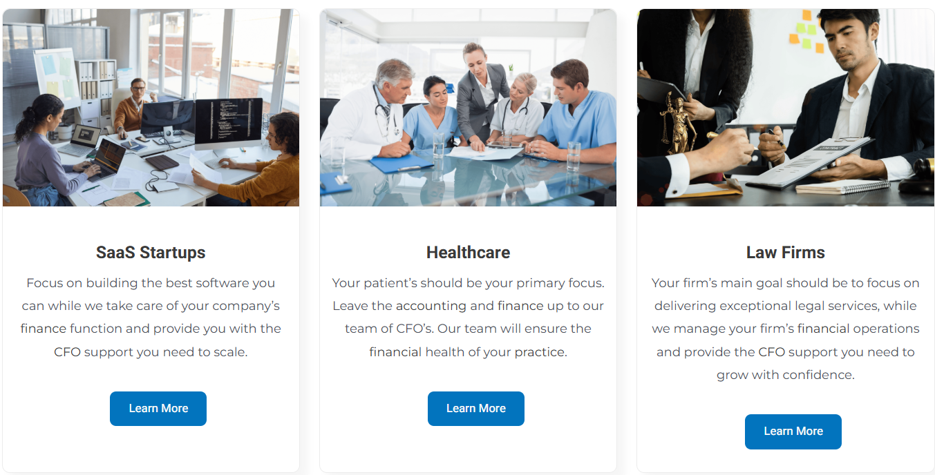 - Integrate CFO, fractional CFO, and controller services for operational excellence
